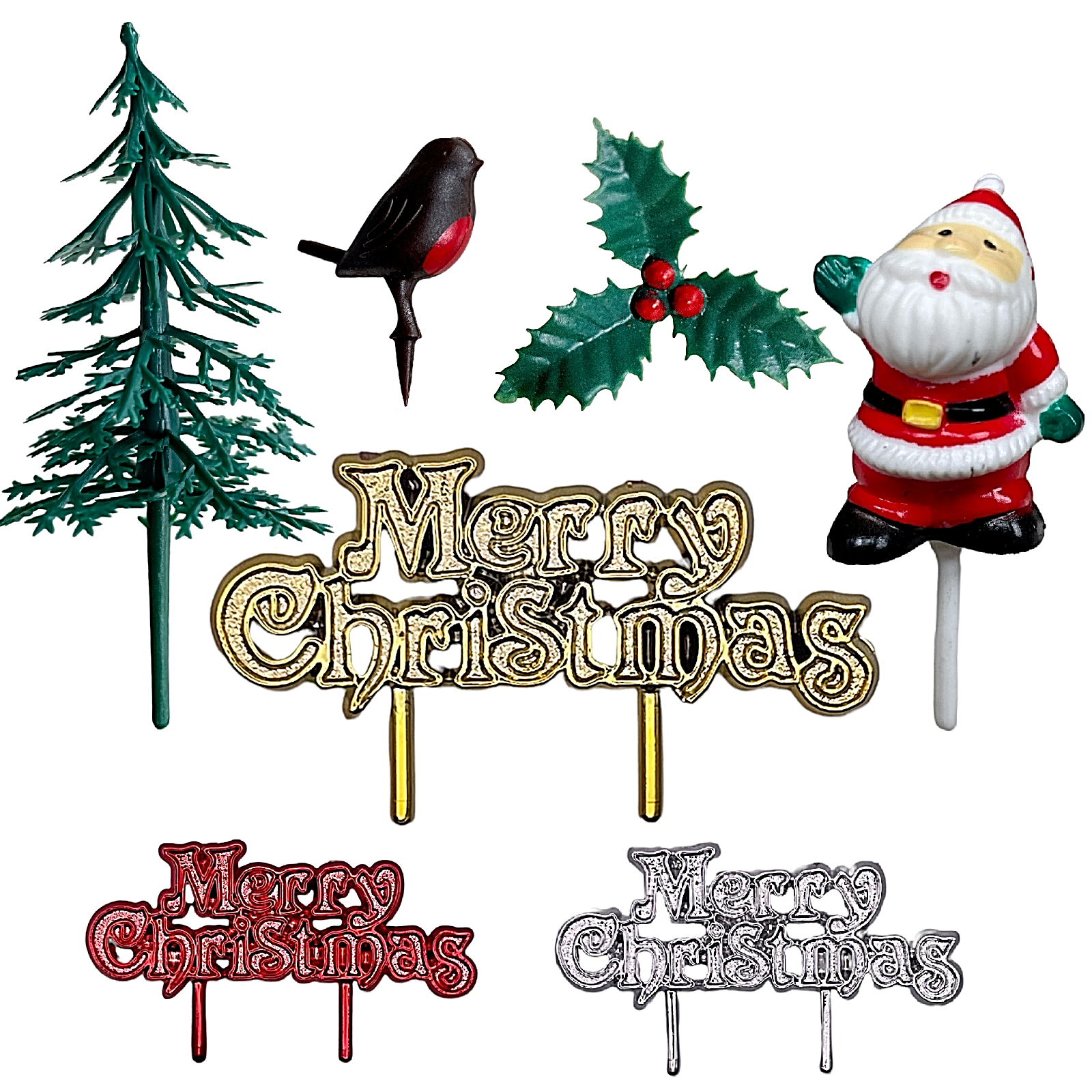 5pc Christmas Cake Topper Decoration Set Holly Tree Robin Santa Snowman Yule Log