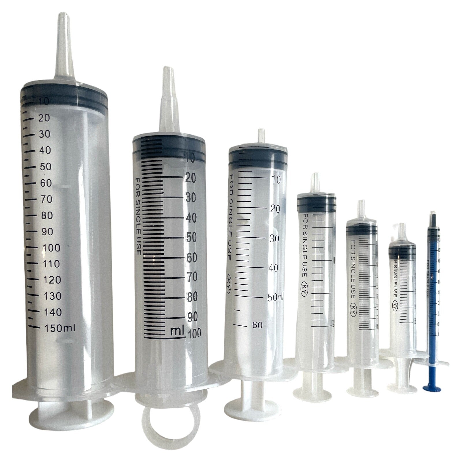 1ml, 5ml, 10ml, 20ml, 50ml, 100ml, 150ml.