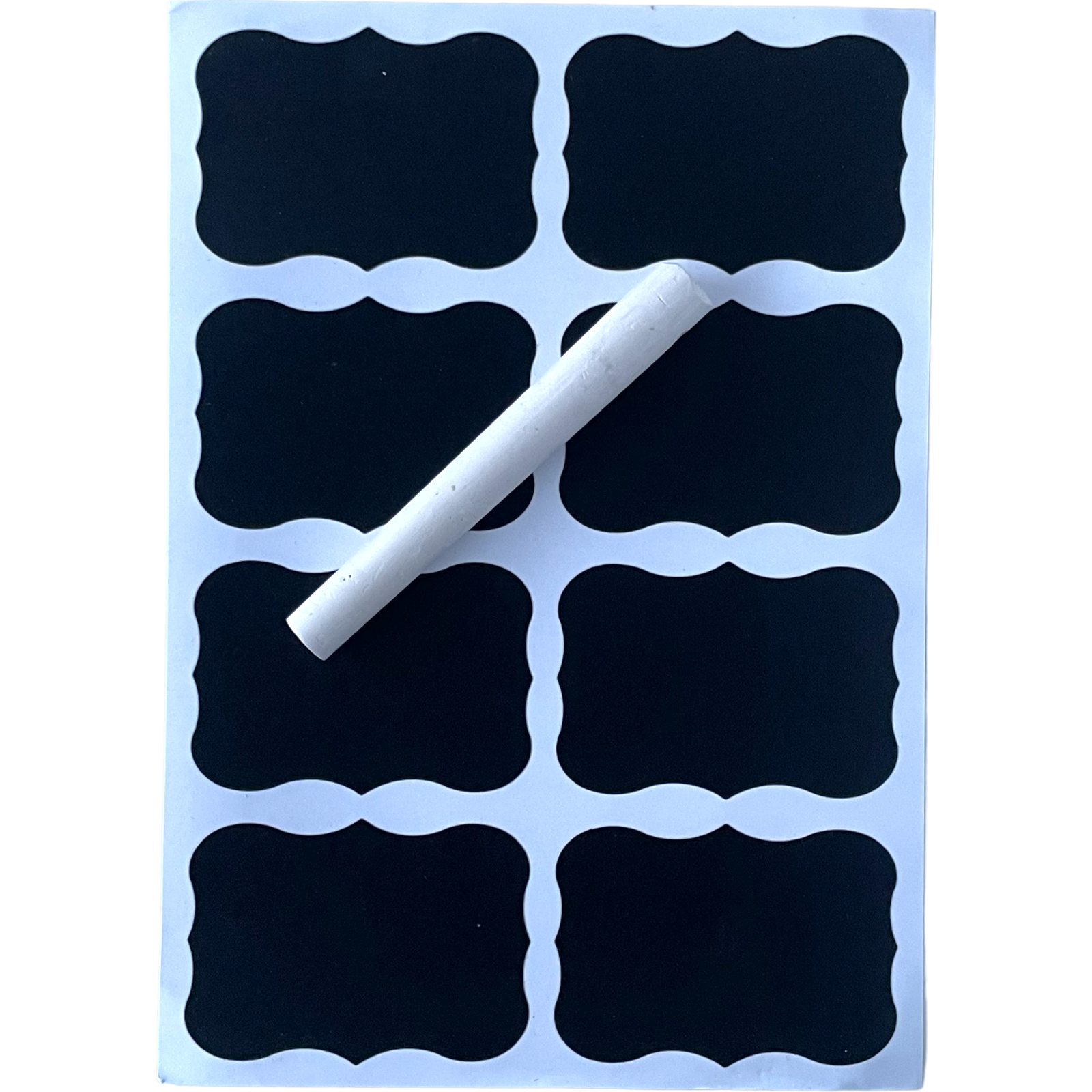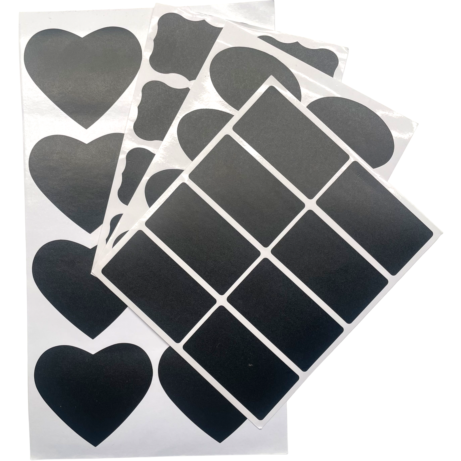 Traditional-style blackboard stickers feature wipe-clean surfaces making them reusable over and over again!