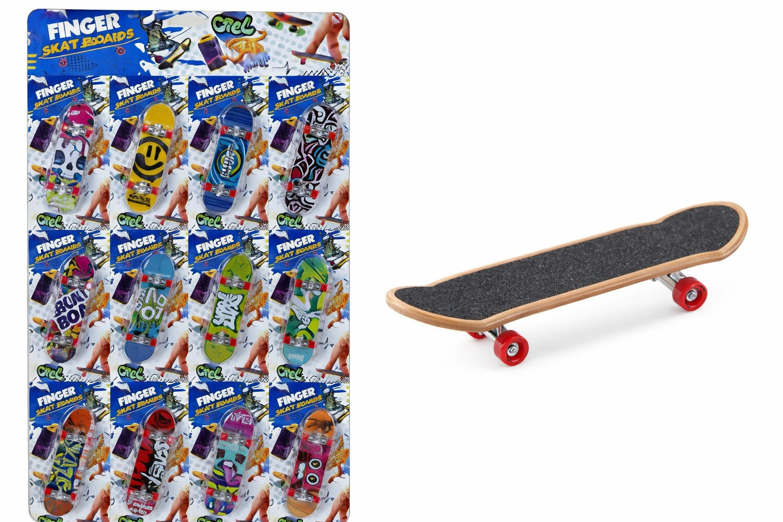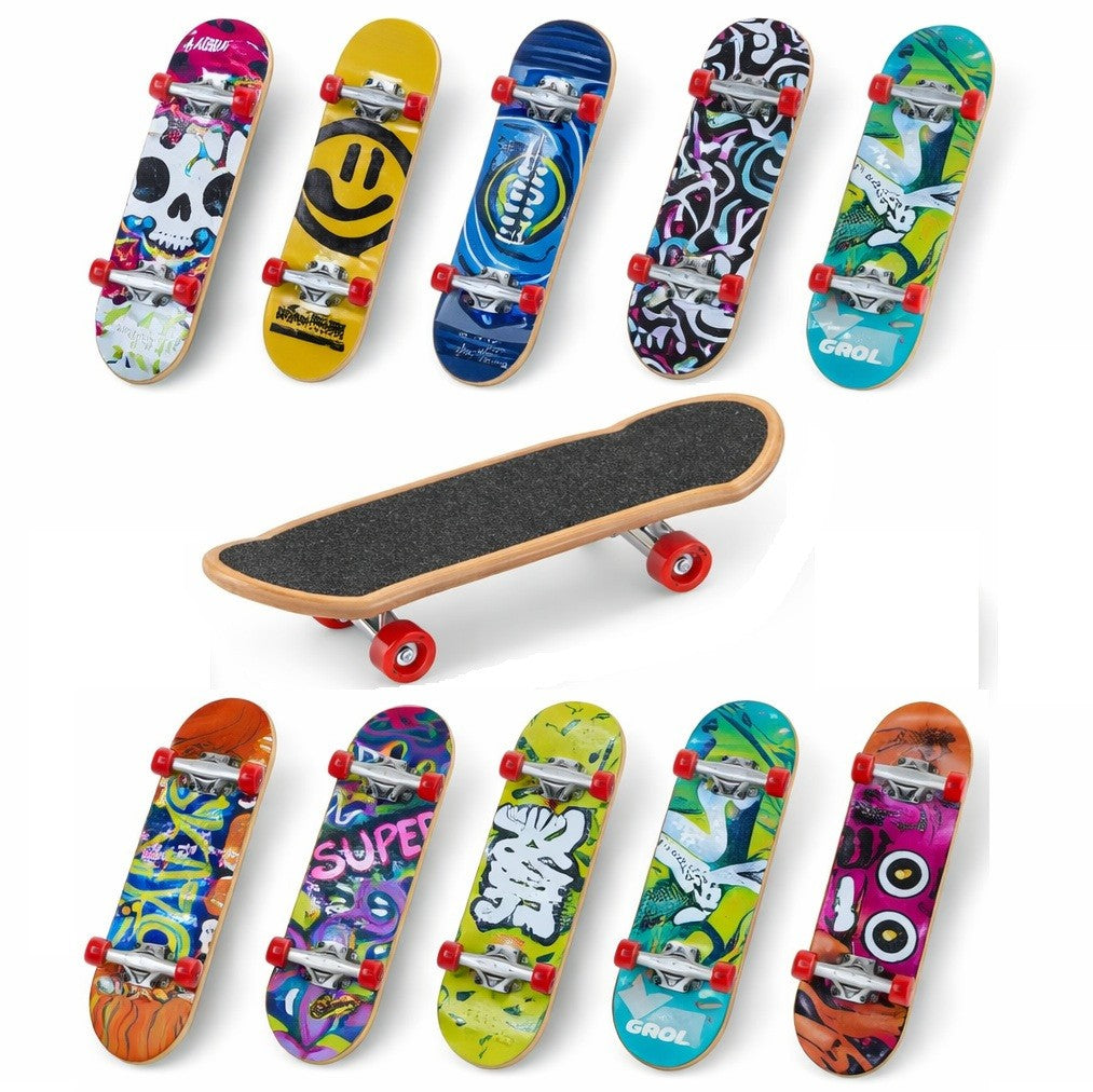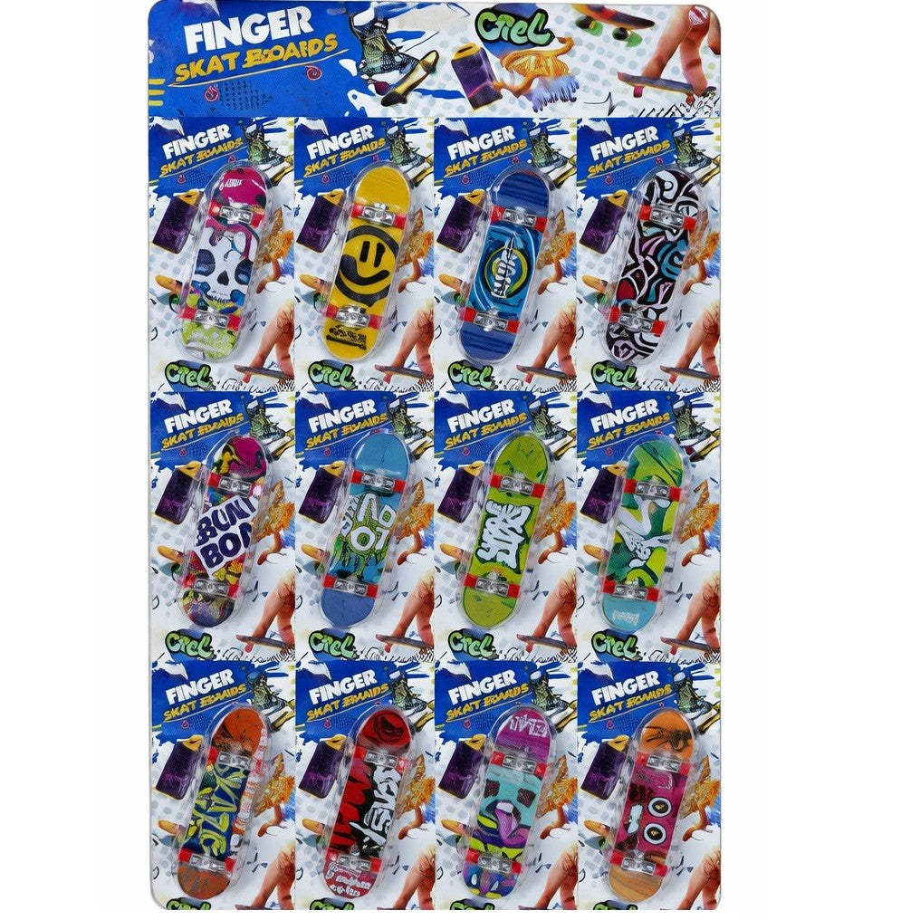 Mini Finger Skateboards, each measuring 9.5cm x 2.5cm. Each board features a cool, unique design with vibrant colors and fun graphics. Perfect for keeping kids entertained for hours, these mini skateboards are perfect for practicing tricks and having fun.